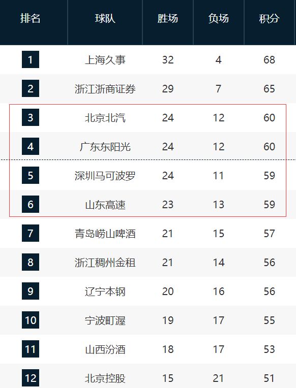 北京男篮目前24胜12负,暂列第三;广东男篮也是24胜12负,暂列第四;深圳男篮24胜11负,少打一场比赛,暂列第五;山东男篮23胜13负,暂列第六。后面的青岛、浙江、辽宁等球员落后稍微多一点,争前四应该没有希望了,主要是北京、广东、深圳、山东这四支球队争夺前四,直白一点就是争第三和第四。前四不需要打季后赛首轮,直接晋级八强,季后赛还有主场优势。