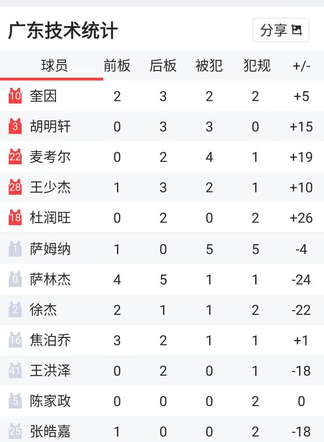 答案不妨从赛后的球员数据栏来找,赛后球员数据统计,不难看出,广东队的首发和替补阵容的正负值差距明显,杜润旺只拿到3分,正负值+26,胡明轩第四节9中1,三分6中0,但正负值依旧有+15之多,比较让人欣慰的是麦考尔,虽然只得到了8分,但正负值高达+19(麦考尔搭配胡明轩效果不错),广东队一阵容整体表现出色。