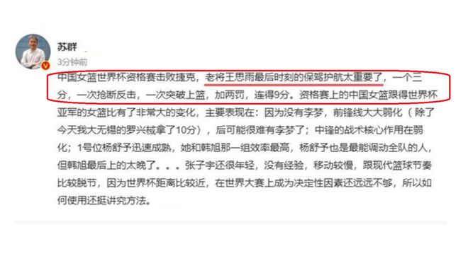 在赛后,国内知名解说员苏群,也是充分肯定了王思雨的作用,他表示老将王思雨,在最后的时刻的保驾护航,对中国女篮来讲,真的是太重要了。王思雨的一个三分球,一个抢断,两次罚球,连续得了9分,太重了!