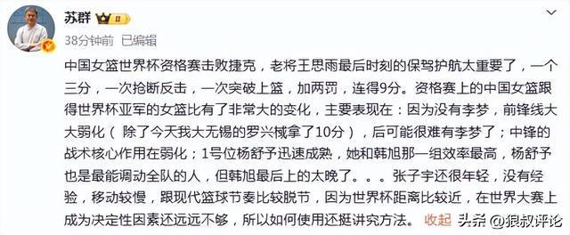 女篮险胜捷克引热议!苏群:张子宇与现代篮球脱轨 很难再有李梦了