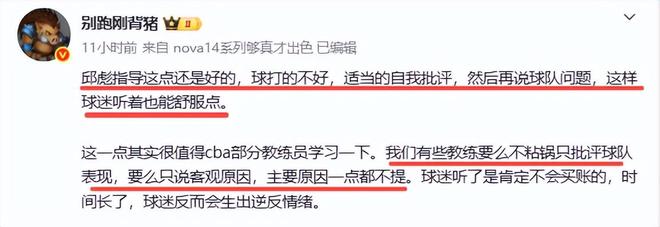 值得注意的是,山东队输球后,邱彪赛后已是多次揽责和向球迷道歉。昨晚仍然是如此,先揽责后再批评队员,批评也就让人接受了。邱彪的做法也获得媒体人的点赞。别跑刚背猪就在社媒表扬了邱彪,同时暗批了一些教练,就差点说出名字了。
