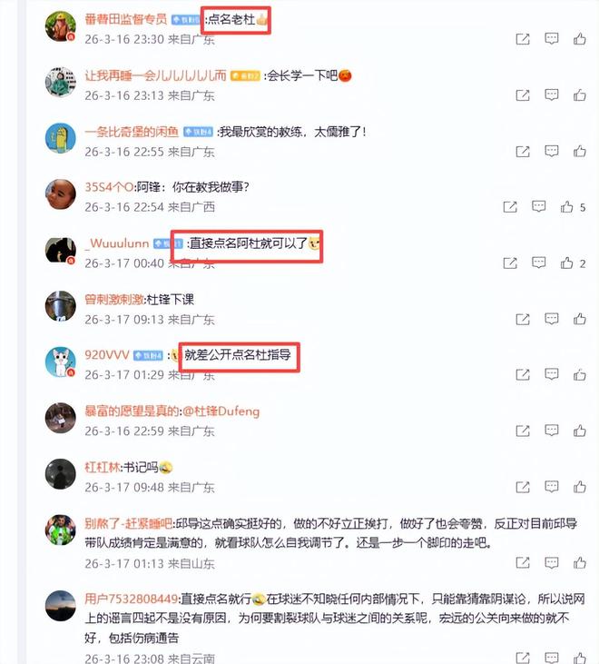 球迷纷纷评论杜锋,“直接点名阿杜就可以了”、“就差公开点名杜指导”、“杜锋只会甩锅”、“直接点名就行,在球迷不知晓任何内部情况下,只能靠猜靠阴谋论,所以说网上的谣言四起不是没有原因,为何要割裂球队与球迷之间的关系呢,宏远的公关向来做的就不好,包括伤病通告”。球迷说得不错,媒体人别跑刚背猪说的也不错,如果内涵杜锋也没有错,杜锋确实是一个骂人和甩锅见长的教练,三连冠前六年无冠,三连冠后又五年无冠了,如今江郎才尽,黔驴技穷,连一个阵容严重不全、排名非常靠后的新疆队也打不过,主场大比分输给辽宁队太丢人。如今5战4负,威信扫地,原来支持、赞美他的球迷也纷纷倒戈痛批他。大家都要求杜锋下课,都说杜锋一日不走,广东队就没有出头之日。