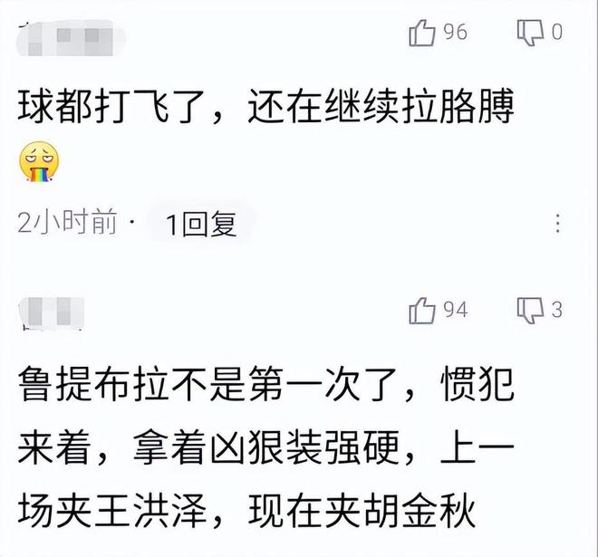 广东球迷也表达了不满:鲁吐布拉这不是第一次了,惯犯来着,拿着凶狠装强硬,上一场夹王洪泽,现在夹胡金秋;这种动作要停赛,直接对人,太恶劣了。