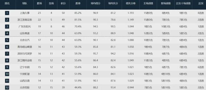 本赛季至今,北京队取得17胜10负排名联盟第五,落后于上海队(23-4)、广厦队(22-5)、广东队(19-8)和山东队(17-10)。