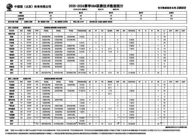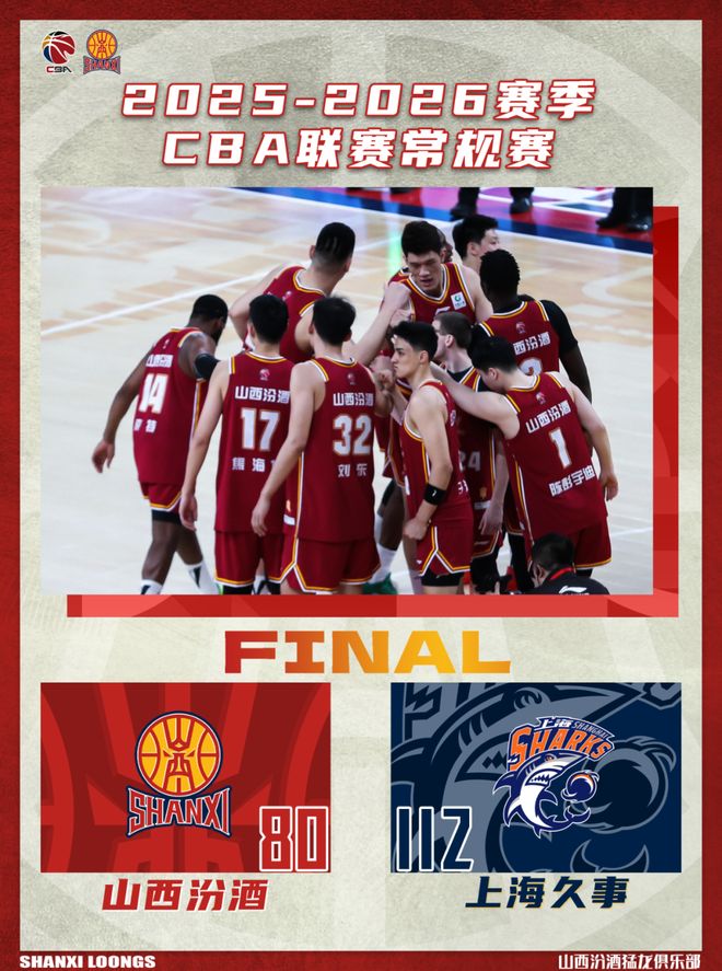 北京时间2026年3月25日19:35,2025-2026赛季常规赛第30轮继续进行,山西汾酒回归主场迎战上海久事。两队历史上共交手45次,山西汾酒21胜24负。上赛季两队交手2次,山西汾酒1胜1负;本赛季两队交手1次,山西汾酒0胜1负。本场比赛,山西队发挥糟糕,攻防两端被对手全面压制,防守端缺乏积极性和主动性,给了对手太多轻松得分的机会,导致大比分落败,最终全场比赛结束,山西汾酒80:112不敌上海久事。希望球队尽快总结调整,以积极的态度面对接下来的比赛。