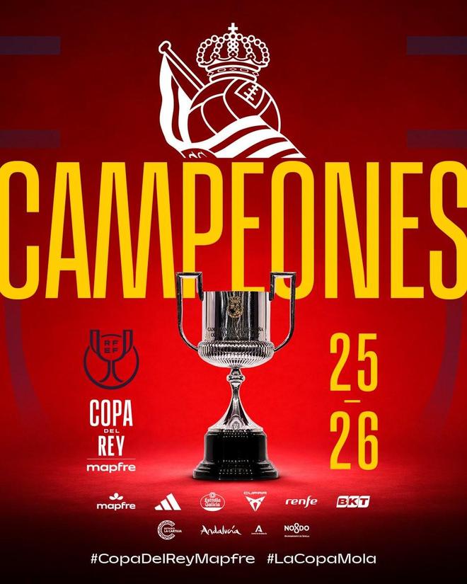 2025-26赛季国王杯决赛,皇家社会通过点球大战击败马德里竞技夺冠,这是皇家社会队史第三次夺得国王杯冠军。