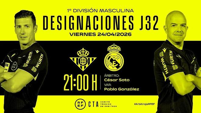 西班牙足协官方公布了本周五西甲比赛皇家贝蒂斯vs皇家马德里的裁判安排,索托-格拉多将担任主裁。
