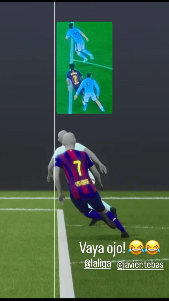 赛后,费兰-托雷斯更新社交媒体动态,晒出了VAR越位划线图,写道:“好眼力!(Vaya ojo!)”并艾特了西甲联赛官方账号和西甲主席特瓦斯。