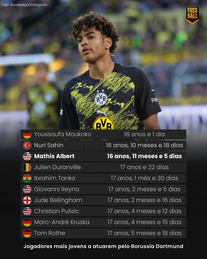 在多特主场对阵弗赖堡的比赛中,16岁小将马蒂斯-阿尔伯特代表多特替补出场完成一线队首秀,据统计,他是多特队史第三年轻出场球员。