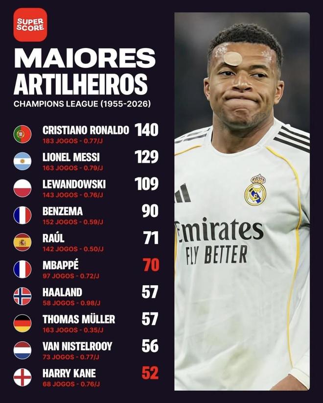 但想冲击前二,尤其是C罗,那是真难。梅西129球,C罗140球,差距分别是59球和70球。这种量级的差距,根本不是靠一两个高产赛季就能填平的,这要求他连续很多年都必须保持在顶级水平。欧足联历年数据里,C罗拿过单赛季17球、16球、15球的数据,梅西也有多次12到14球的高产年。姆巴佩本赛季进15球,说明他具备这种单赛季冲高的能力,但要把“具备能力”变成“好多年一直保持”,中间还得抗住伤病、球队战绩起伏、状态下滑这些现实因素。新赛制能帮他拉近距离,但抹平不了这道门槛。