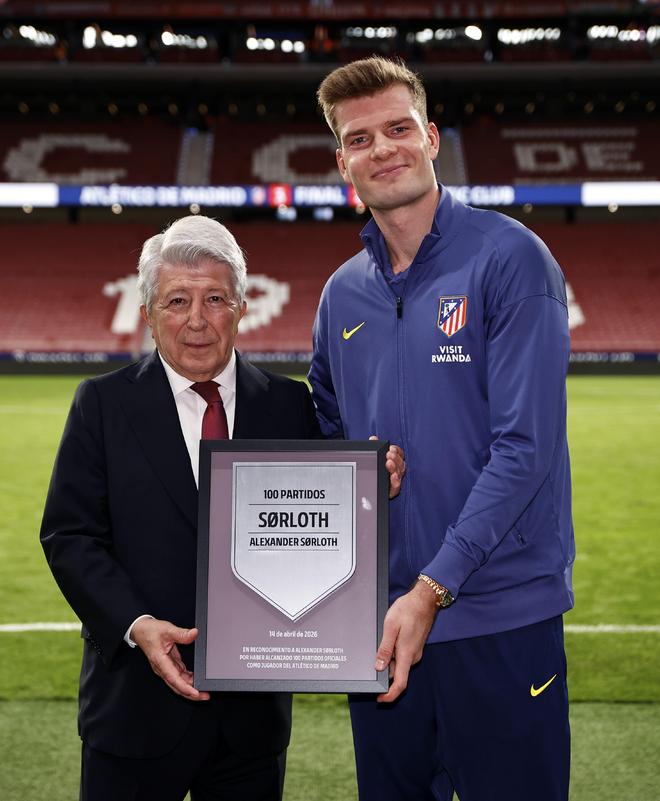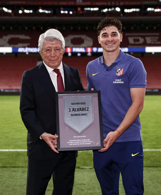 马竞官方写道:“我们的主席恩里克-塞雷佐,为胡利安-阿尔瓦雷斯与亚历山大-瑟洛特分别颁发了纪念铭牌,二人都已身披红白战袍为马竞出战满100场正式比赛。”