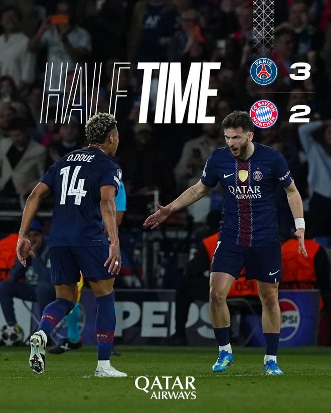 第45分钟,对方手球犯规,裁判回看VAR后判罚点球,登贝莱主罚命中!上半场结束,球队暂时3-2领先拜仁慕尼黑!