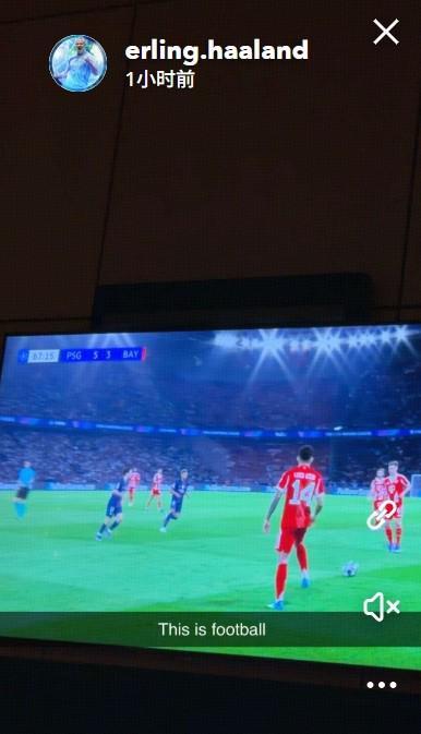 曼城前锋哈兰德在社交媒体发布了一则动态,显示他正在电视上观看本场比赛,照片上比分为巴黎5-3拜仁,哈兰德配文:“这就是足球。”