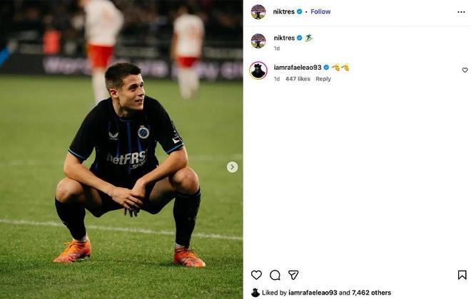 在布鲁日3-0赢下标准列日的比赛中,特雷索尔迪帮助球队首开纪录后,模仿了莱奥标志性的“冲浪”庆祝动作,并将其发布到自己的社交平台,“遭遇剽窃”的当事人莱奥还在帖子下评论了一个敬礼的表情符号。