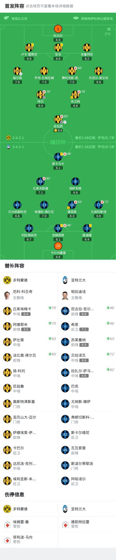 第42分钟,吉拉西左路传中,拜尔后点推射空门破门,多特2-0亚特兰大