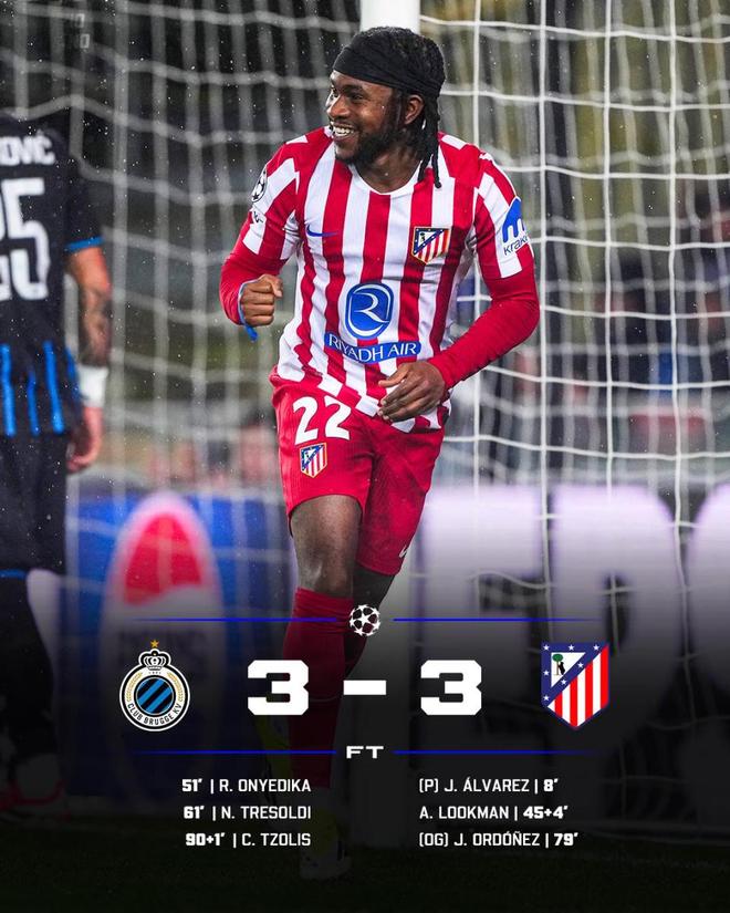 马德里竞技客场挑战布鲁日,原本一度手握两球优势,却在第89分钟遭绝平,西蒙尼无奈只能接受3-3平局收场。