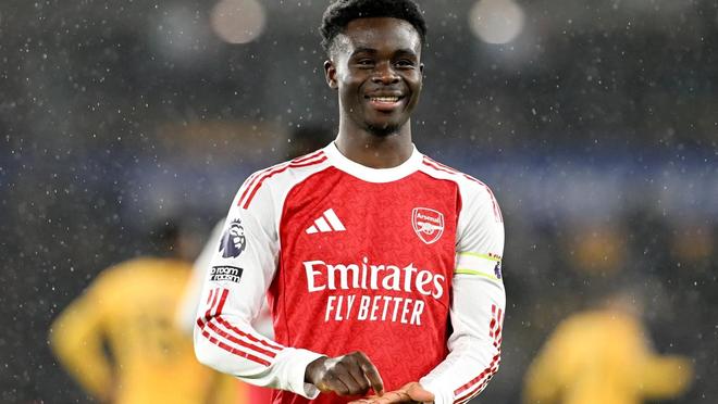 英超第31轮客场挑战狼队的比赛中,萨卡开场仅5分钟就为阿森纳首开记录。