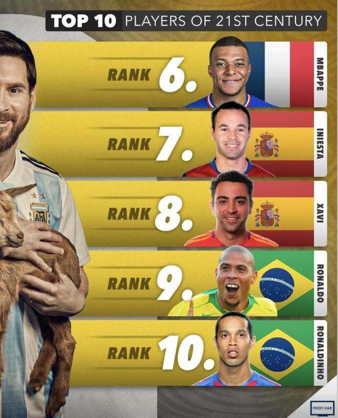 前二不动;第3到第5更该在齐达内、莫德里奇、伊涅斯塔/哈维里排列;亨利落到第6到第8更合理;姆巴佩先放第7到第10更稳;罗纳尔多、罗纳尔迪尼奥至少应该有人往前提一档。