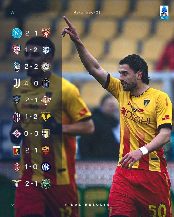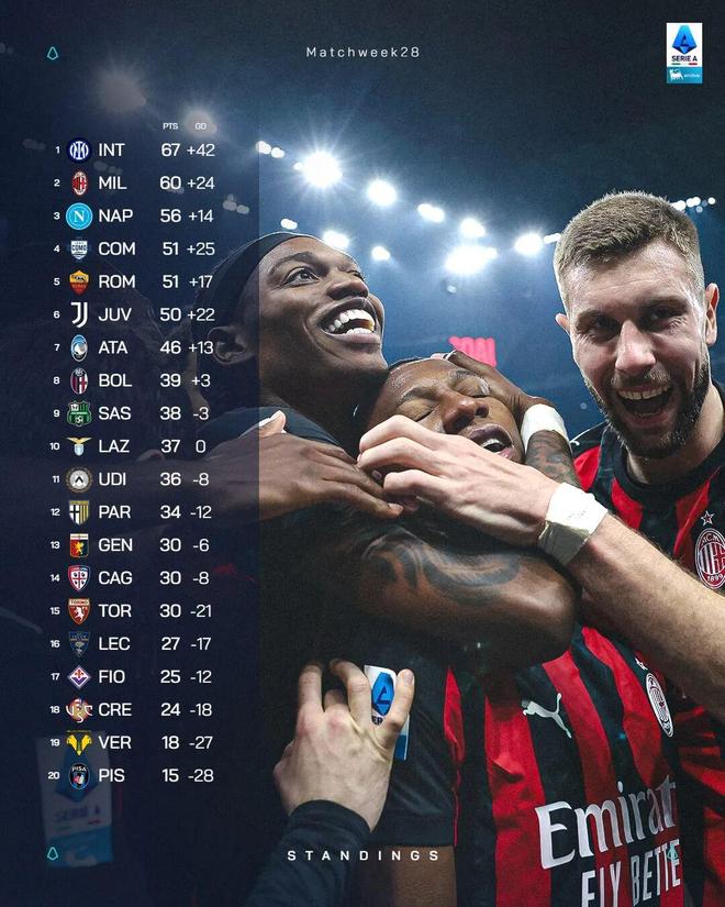 随着本轮最后一场比赛拉齐奥2比1击败萨索洛,意甲第28轮比赛全部结束。本轮联赛的重头戏自然是“米兰德比”二番战,AC米兰主场1比0小胜国米,完成了本赛季对同城对手的双杀,但国米仍然在积分榜上领先红黑军团7分;那不勒斯2比1取胜都灵,仍位居第三;罗马客场1比2负于热那亚,而本赛季“黑马”科莫2比1力克卡利亚里,与红狼军团同积51分,以净胜球优势反超竞争对手来到第四名,罗马跌至第五,尤文仍居第六,距离罗马1分。