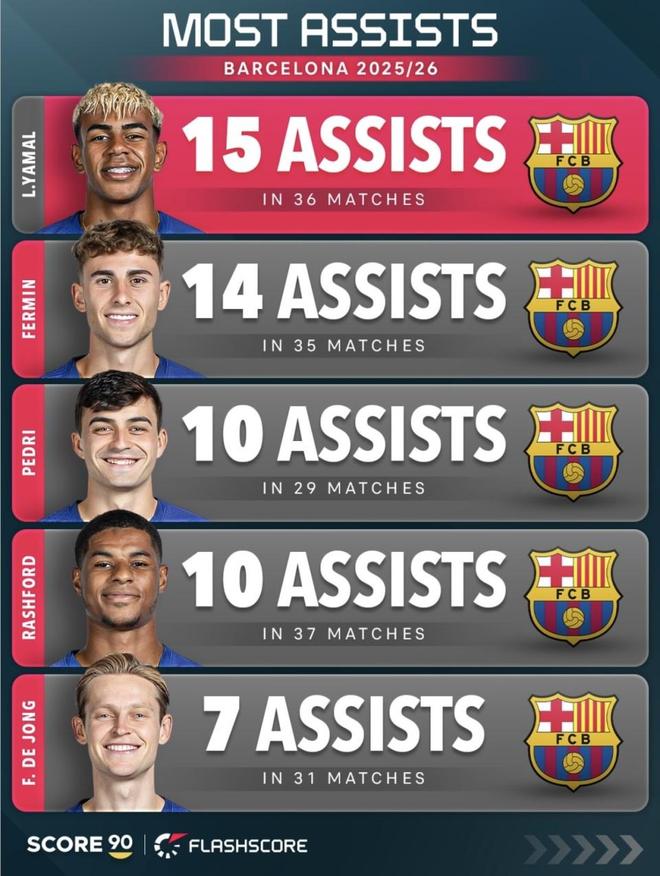 如果说亚马尔代表的是顶级天赋提前接管比赛,那费尔明代表的就是巴萨这套体系里另一种很重要的前场价值。35场11球,参与进球25次,助攻14次,三张榜单里他全部都在前列,而且在助攻榜只比亚马尔少1次。巴萨官方2月下旬还专门写到,他本赛季已经追平自己此前单赛季11球的最佳纪录,而且只用了更少的场次。费尔明最突出的地方,是他不需要像正印边锋那样大量持球,也不用像中锋那样长期站在最前面,但他总能在第二落点、后插上、禁区边缘和肋部连接里把回合补完整。亚马尔把强点做到了最亮,费尔明则把串联和补位做得很满,这也是为什么他在参与进球和助攻榜上都能压得这么靠前。