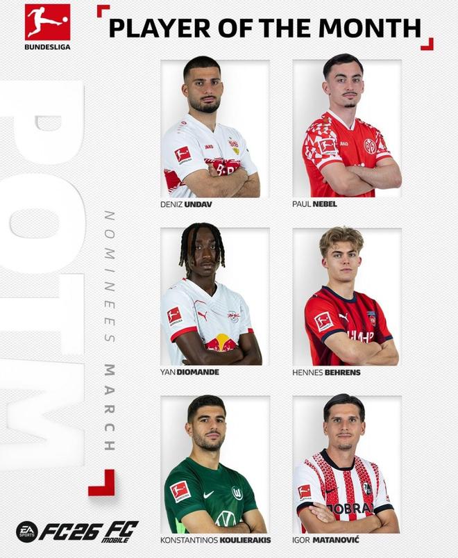 德甲3月最佳球员候选名单公布,昂达夫领衔,迪奥曼德在列。