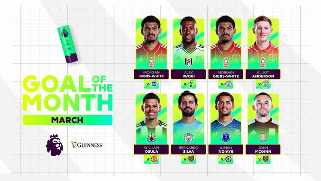 北京时间3月26日,英超官方公布了联赛3月最佳进球的8个候选者,诺丁汉森林3球上榜,伯纳多-席尔瓦对阵西汉姆联的进球以及奥苏拉对阵曼联的绝杀也获得提名。