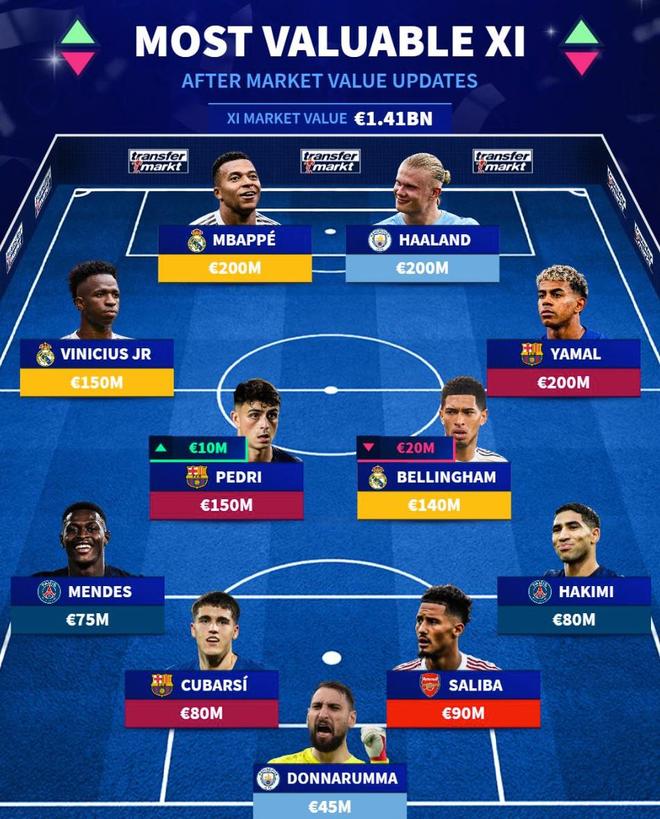 北京时间3月29日,在更新了欧洲五大联赛球员的身价之后,德转列出了目前世界足坛最贵的11人阵容,姆巴佩、哈兰德以及亚马尔同以2亿欧元领衔。